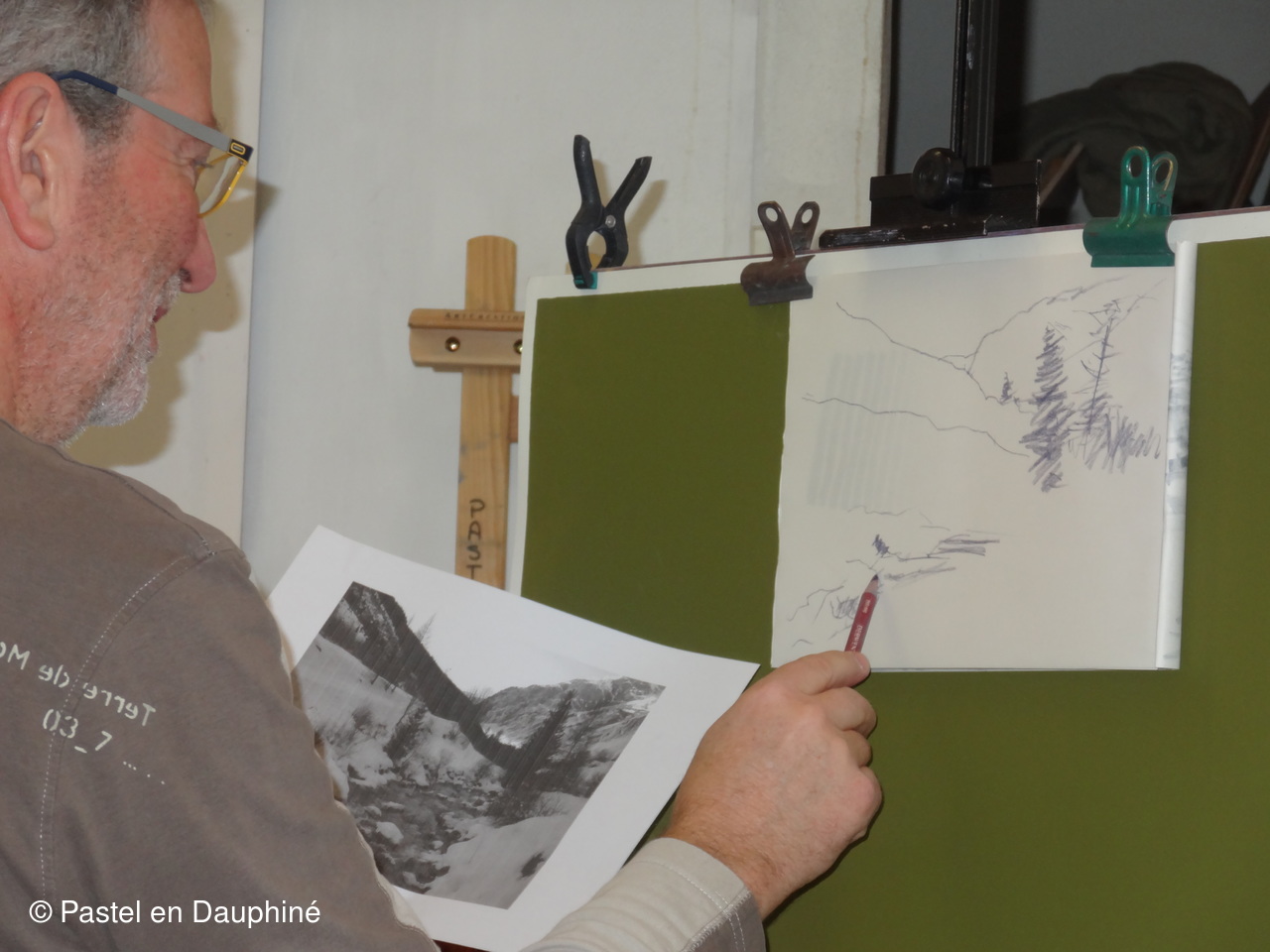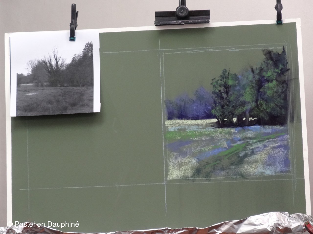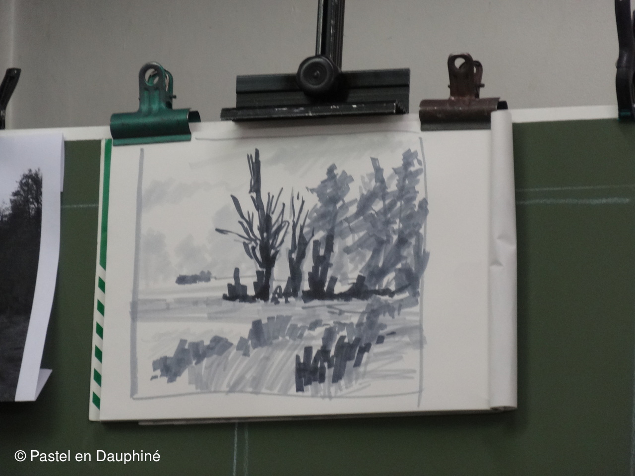 Pour démarrer le pastel : une photo en noir et blanc et un croquis pour les valeurs et la composition