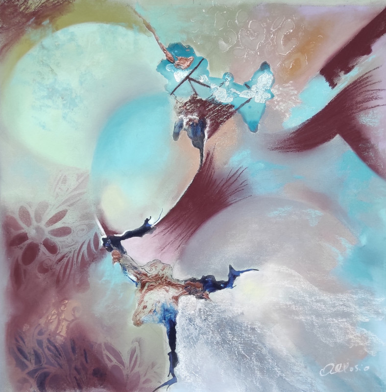 "L’œuvre est un hymne à la paréidolie, cette tendance humaine à voir des formes reconnaissables là où il n'y en a pas, une invitation à plonger dans l'abstrait pour y décoder l'essence même de notre humanité. Ici, c’est l’évocation de la grâce des danseuses. Dans cette symphonie visuelle, le contraste entre le cadre carré et le cercle central évoque un dialogue entre l'ordre et le chaos, le fini et l'infini, la terre et le ciel, rappelant que nous sommes tous des danseurs sur le grand plancher du cosmos, chacun suivant les pas que dicte l'harmonie universelle. "Danse Cosmique » est une fenêtre ouverte sur la grâce, sur l'âme, un voyage à travers les couleurs et les formes qui nous incite à trouver la danse dans le silence, le mouvement dans l'immobilité, la vie dans l'inanimé."